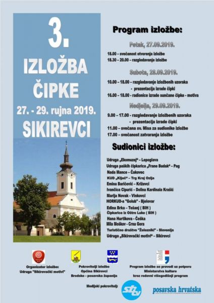 3. Izložba čipke održat će se od 27. do 29. rujna 2019. u Sikirevcima. Svečano otvorenje izložbe zakazano je za 27. rujna u 18 sati.