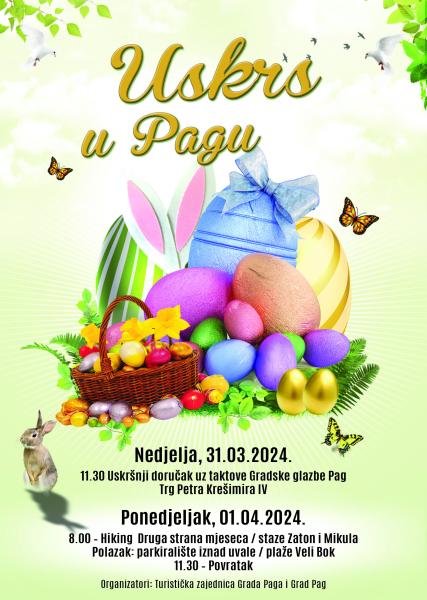 Povodom uskrsnih blagdana Turistička zajednice Grada Paga i Grad Pag pripremili su bogat i zanimljiv program. Središnje događanje održat će se na sam blagdan Uskrsa, nakon mise u 11.30 sati, a posjetitelji i stanovnici grada Paga moći će uživati u tradicionalnom uskrsnom doručku i najbogatijem otočnom gastro stolu. U prekrasnom ambijentu ispred Zborne crkve Uznesenja blažene djevice Marije, uz glazbene taktove Gradske glazbe Pag, posjetitelji će degustirati najbolje paške gastronomske specijalitete i delicije, predvođene paškim sirom, skutom, šparogama i drugim kuhanim jelima uz prigodne uskršnje slastice.