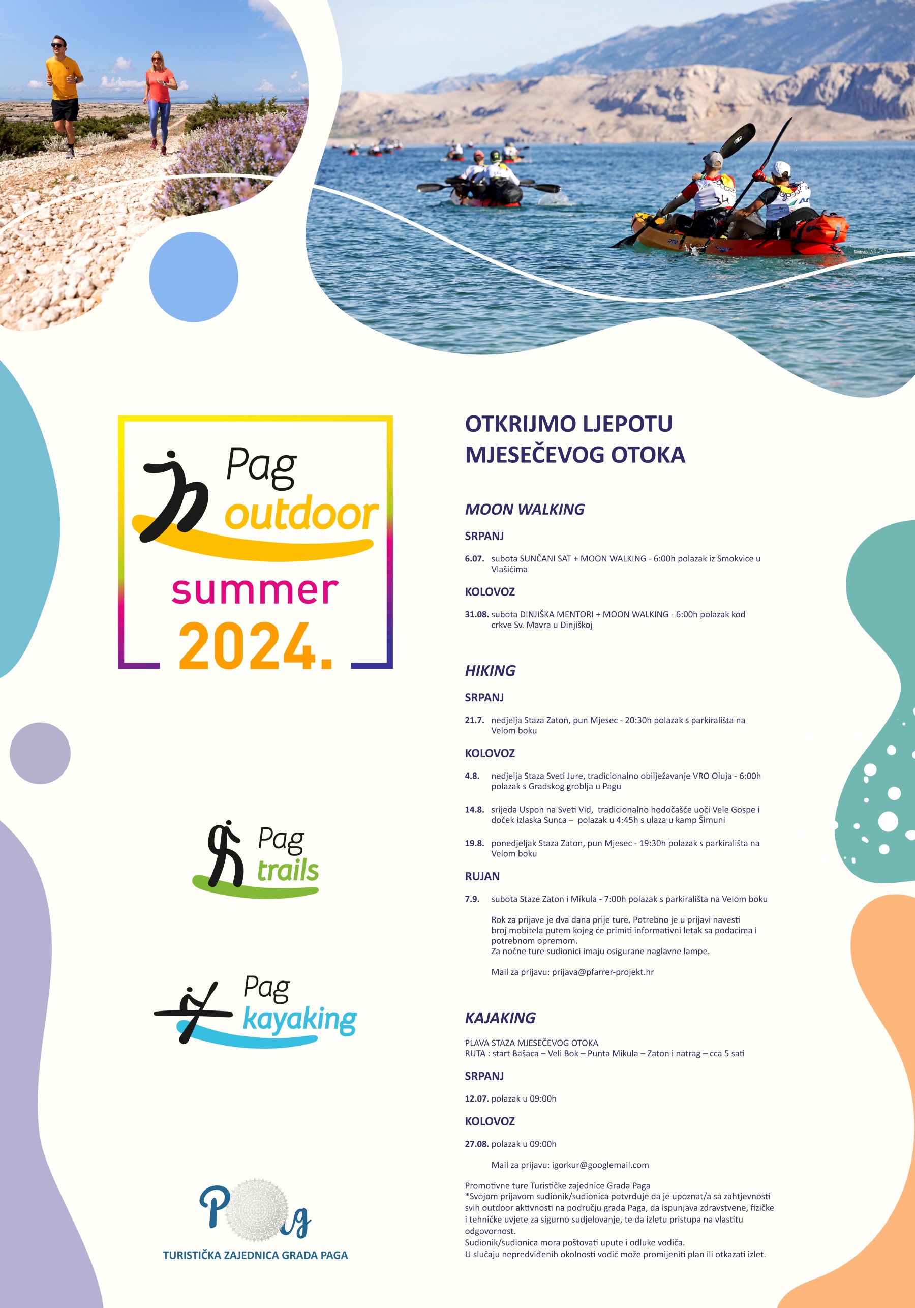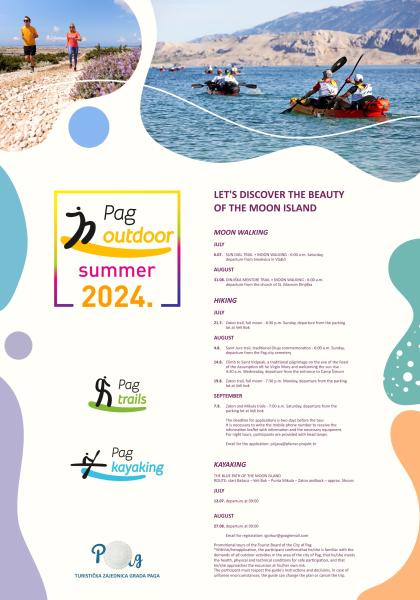 Turistička zajednica Grada Paga i ove godine u turističkoj sezoni organizira Pag Outdoor Summer ture - sportske aktivnosti za sve uzraste na području Grada Paga. Uz besplatno vođenje, posjetitelji će otkrivati ljepotu mjesečevog otoka i uživati u kajakingu, hikingu i moonwalkingu. Ovaj jedinstveni događaj okuplja ljubitelje prirode i avanture pružajući nezaboravno iskustvo u jedinstvenom okruženju.