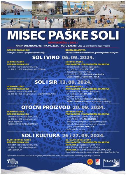 U organizaciji Solane Pag i u suradnji Turističke zajednice Grada Paga, počevši od 5.-og pa sve do kraja rujna u Pagu će se odvijati manifestacija „MISEC PAŠKE SOLI“. U jutarnjim satima u vremenu od 8 do 12 sati organiziran je posjet poljima soli pod nazivom „Jutra u poljima soli” uz edukacijsku priču i skupljanje soli, a u Pagu na staroj rivi moći će se razgledati i Stalna izložba solarstva u Prvom magazinu u vremenu od 8 do 21 sat.