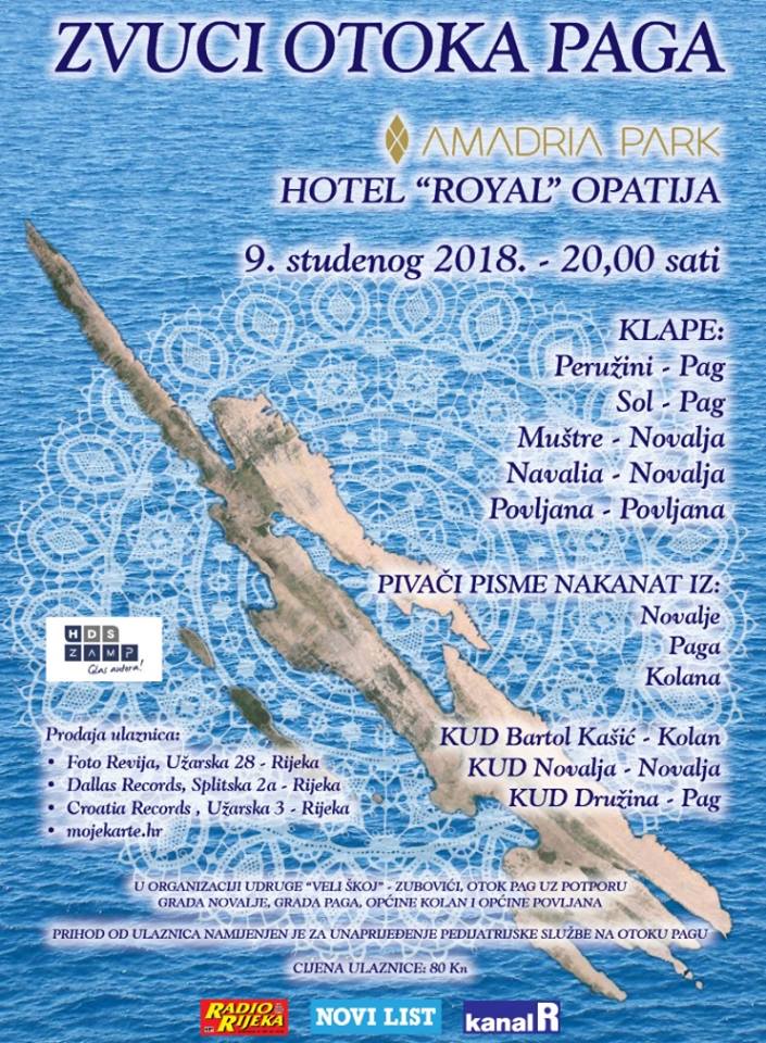 Manifestacija Zvuci otoka Paga održat će se 9. studenog 2018. godine u hotelu Royal u Opatiji s početkom u 20:00 sati.