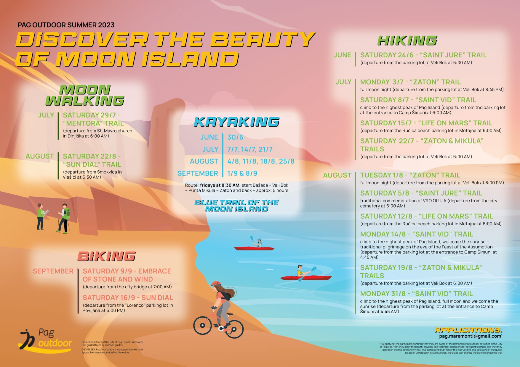 Turistička zajednica Grada Paga u suradnji sa Udrugom sportskog turizma Pag MareMonti i ove godine u turističkoj sezoni organizira Pag Outdoor Summer ture te brojne sportske aktivnosti za sve uzraste na području Grada Paga. Uz besplatno vodstvo licenciranih vodiča, posjetitelji će od kraja lipnja do sredine rujna otkrivati ljepotu mjesečevog otoka i uživati u kajakingu, hikingu, moon walkingu i biciklizmu.