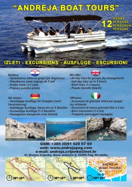 Andreja Boat Tours was established in 2012, and since then many satisfied guests have had the opportunity to explore the hidden beauties of Pag’s numerous coves, beaches and caves that can most often only be reached by sea. The boat can admit 12 passengers, and private excursions can be organized for smaller parties. At an average speed of 12 nm, most sites can be reached within 15 minutes.