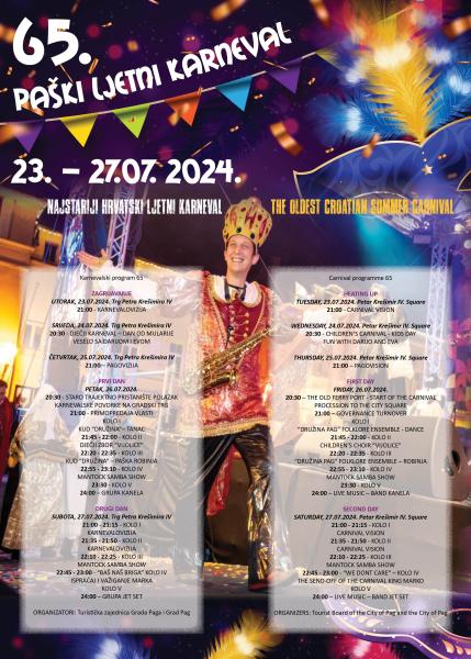 U organizaciji Turističke zajednice Grada Paga i Grada Paga od 23.-27. srpnja održat će se 65. Paški ljetni karneval. Najstariji hrvatski ljetni karneval tradicionalno će obilovati bogatim programom koji uključuje razne događaje i nastupe koji će užariti karnevalsku atmosferu u Pagu.