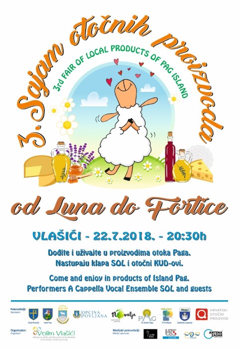 Udruga Volim Vlašići organizira 3. Sajam otočnih proizvoda „Od Luna do Fortice“, 22. srpnja 2018. godine u Vlašićima na otoku Pagu s početkom u 20.30 sati.