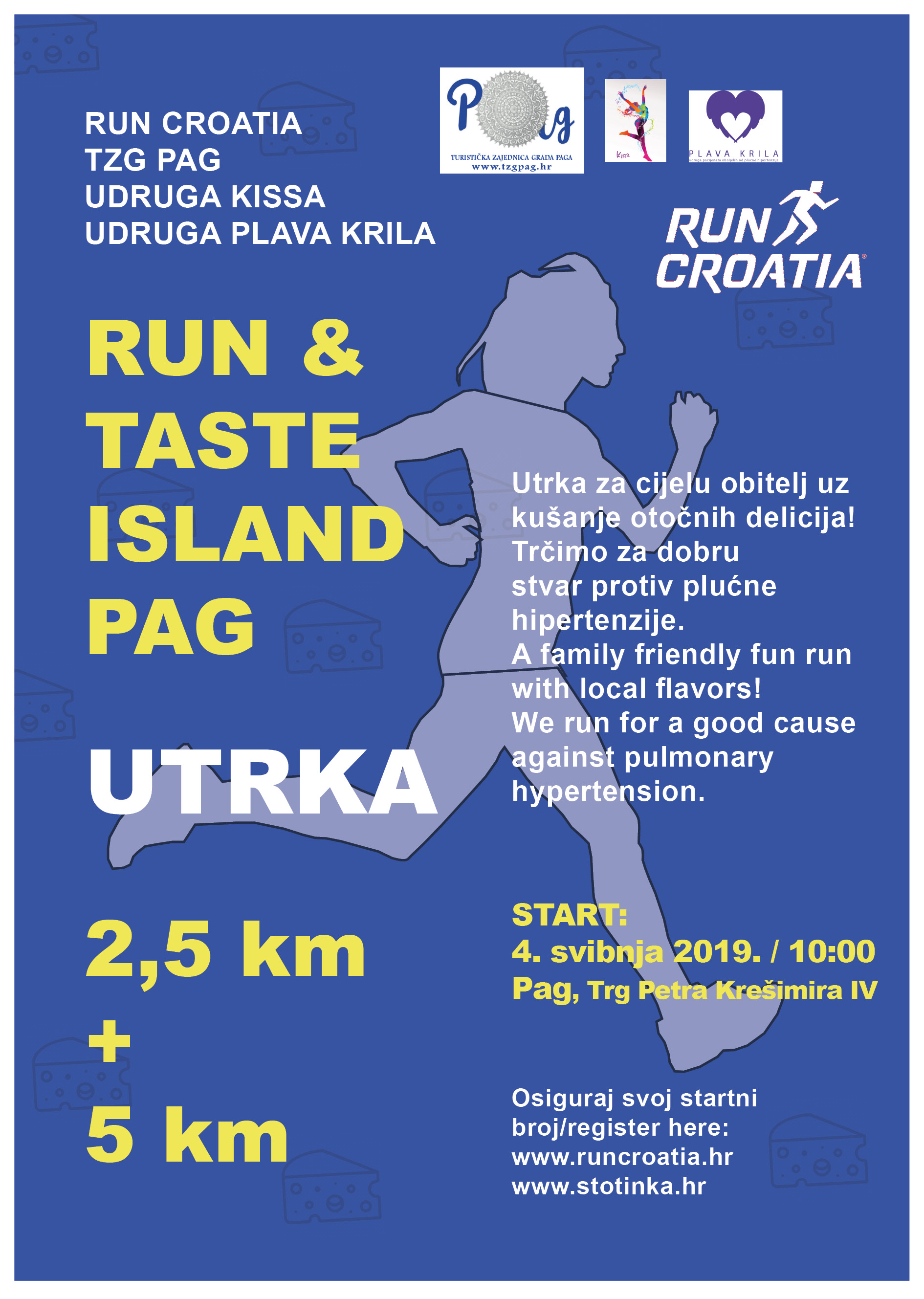 U organizaciji Run Croatia, Turističke zajednice grada Paga i udruge Kissa, u subotu, 4. svibnja u Pagu održati će se utrka humanitarnog karaktera RUN & TASTE ISLAND PAG. Posebnost ove utrke je ljepota trase koja vodi uz more i kroz povijesni dio grada Paga. Na okrjepnoj stanici kao i na After Run partiju u prekrasnom ambijentu Kneževog dvora dijelit će se “Paški zalogajčić” s autohtonim okusima otoka Paga. Pridružite nam se na utrci u Pagu, u subotu, 4.5.2019.