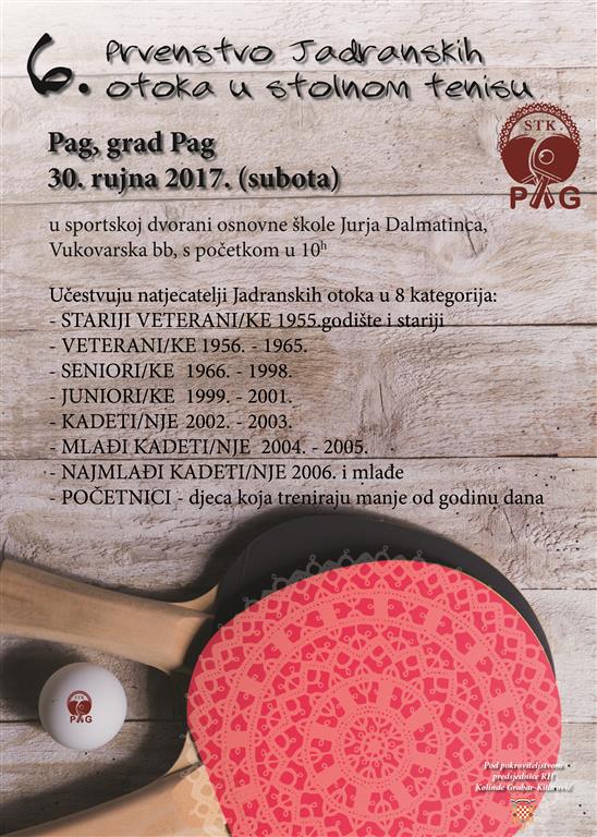 U subotu, 30. rujna 2017. Pag je domaćin 6. Prvenstva Jadranskih otoka u stolnom tenisu koje se održava pod visokim pokroviteljstvom predsjednice RH Kolinde Grabar Kitarović.
