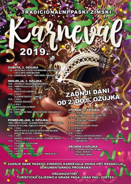 Karnevalsko kolo na pijaci od 17 do 20 sati uz nastup male škole gradske glazbe Pag, KUD-a Družine koji će izvesti Pašku robinju, starinsku pučku dramu čiji začeci sežu u daleku prošlost a ostala je sačuvana u narodu sve do današnjih dana. Nastupit će i narodna glazba iz Trogira te će se održati tumbula uz neizbježnog janjca i paški sir i na kraju podjela lista Baš nas briga.